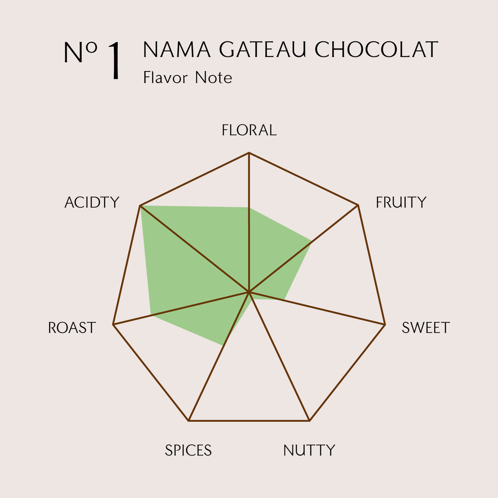 ウィラ産カカオの魅力を引き出すため、栽培から発酵・焙煎にこだわり、素材が持つ複雑な音楽性を引き立たせた後、他産地のカカオのブレンドを掛け合わせてNo.1の生ガトーショコラは誕生しました。食べ進めるごとに広がる味わいと香りのメロディーラインを、どうぞお楽しみください。