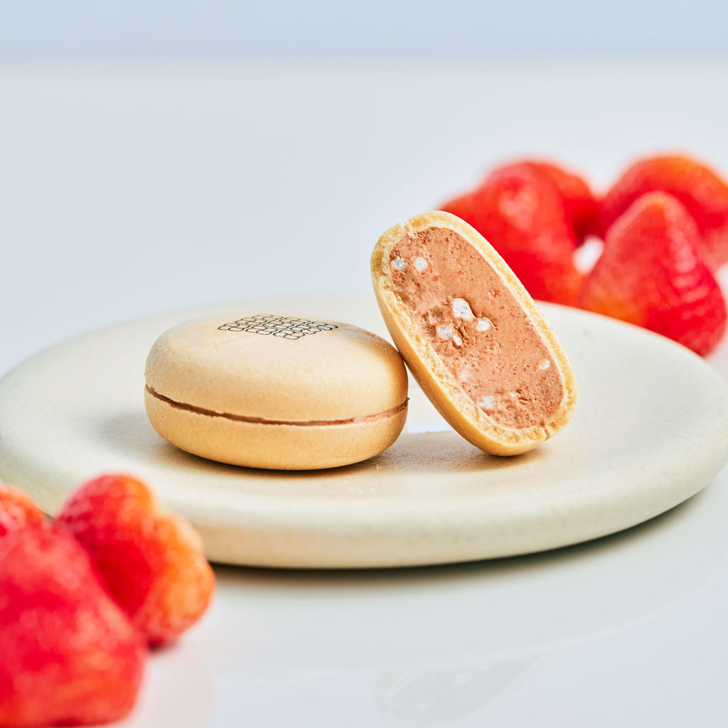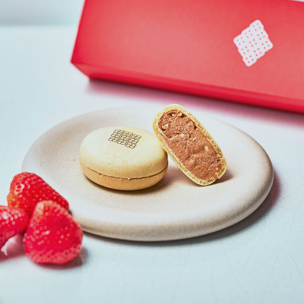 甘酸っぱいあまおうさくさくのモナカにはさまれた、やわらかな口当たりのチョコレートクリーム。華やかなあまおうの風味が広がる、季節限定の味わいです。
