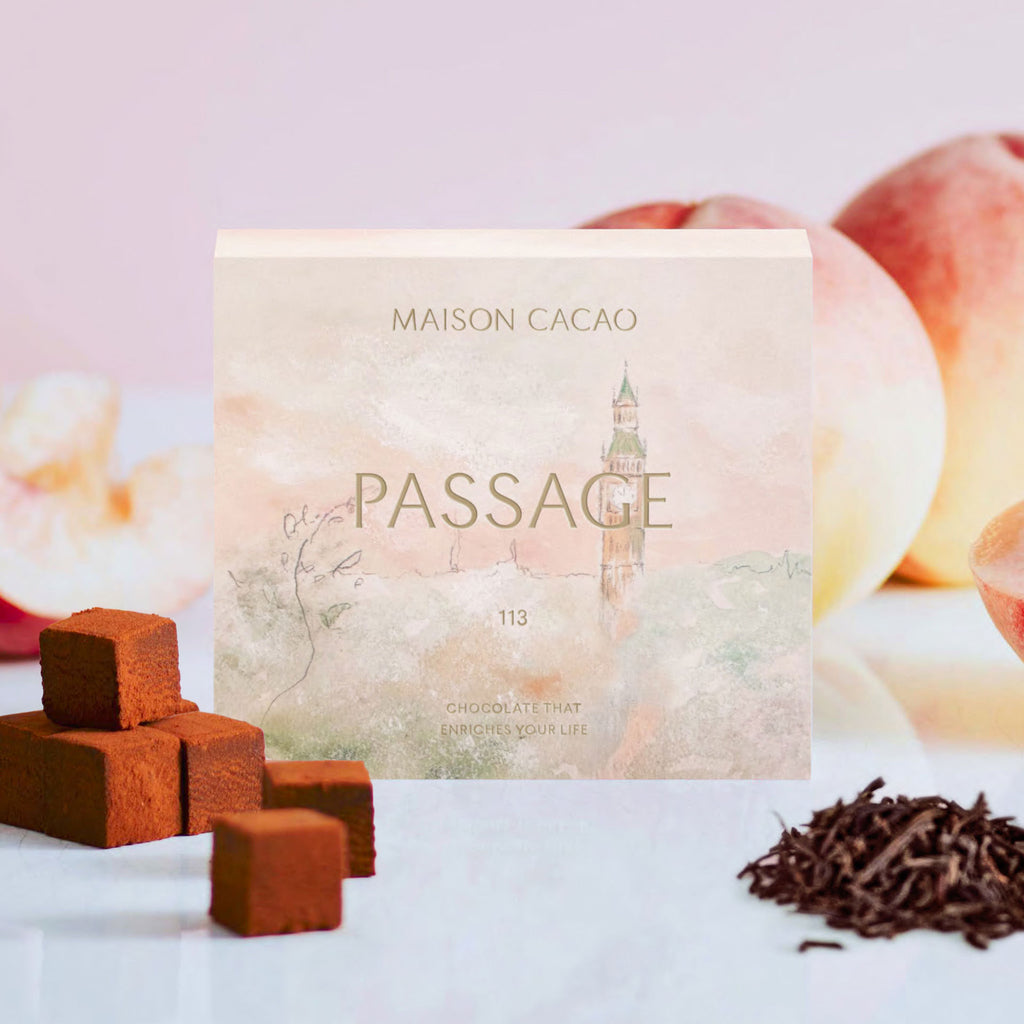 山梨・笠井桃園で育てられた白桃の中から、瑞々しい果汁感と高い糖度をもつ品種を厳選し、華やかに香るアールグレイとミルクチョコレートに重ねました。白桃のやさしい甘みと紅茶の気品が溶け合う、ホワイトデー限定の生チョコレートです。なめらかな口どけとともにやさしく続く余韻は、穏やかな旅路のように心に残ります。