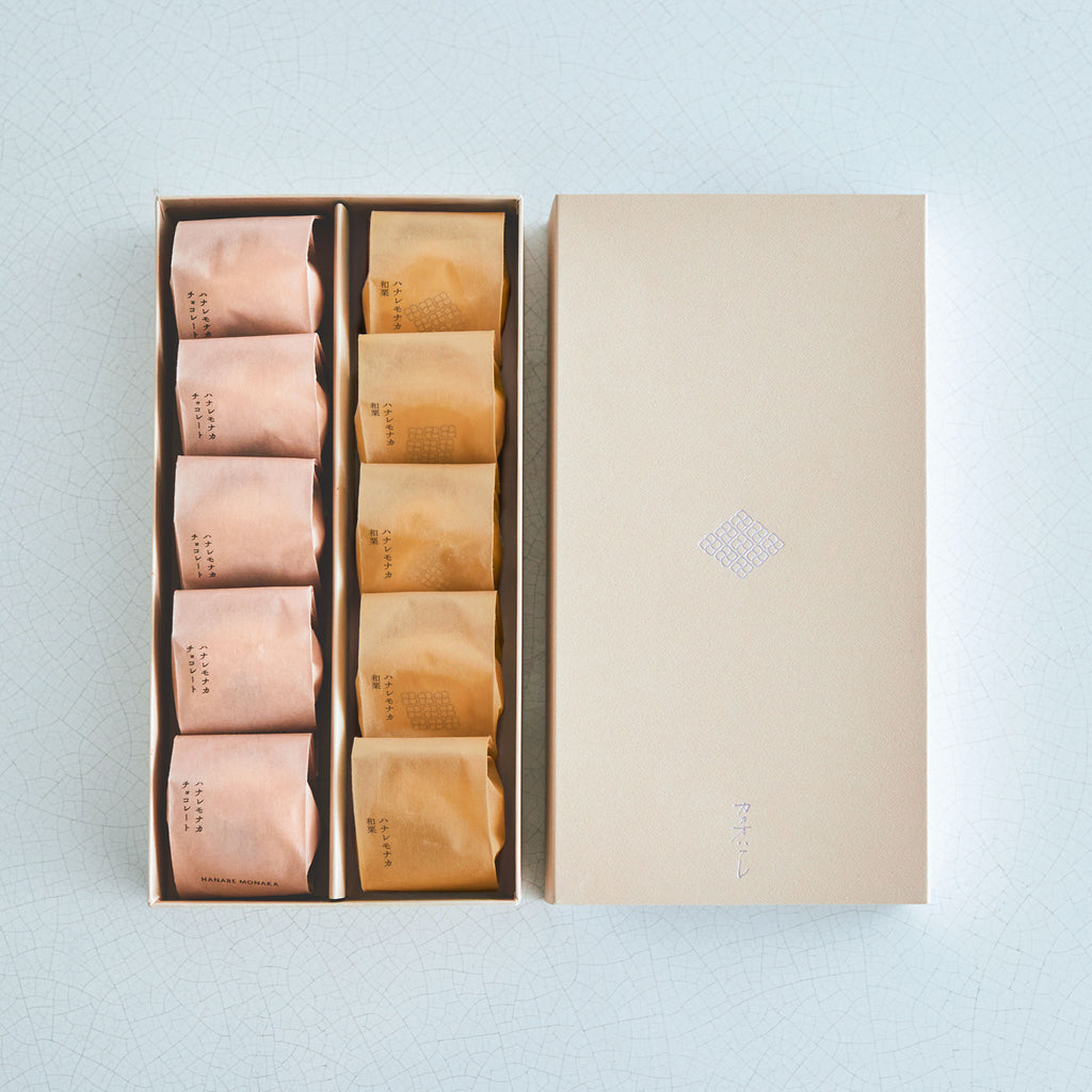 ふわりと軽く口溶けなめらかなチョコレートクリームをパリパリのモナカに挟んだ新食感のハナレモナカ。コロンビア産チョコレートにあられの入った定番の味わいと、小布施産の和栗を合わせた秋限定の味わいをギフトボックスに入れてお届けします。ご自宅用にも、大切な方へのギフトにもおすすめです。