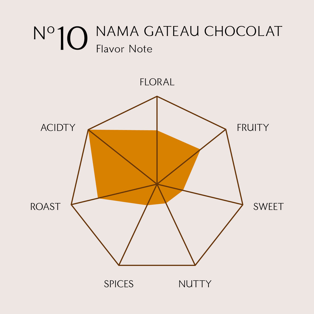 「生ガトーショコラ No.10」は、自然環境が大きく異なる地で育つカカオの個性を、メゾンカカオこだわりのブレンドによって引き立てた一品。シトラスやベリー、トロピカルな味わいが花咲き、余韻に力強いカカオ感が奥深く広がります。